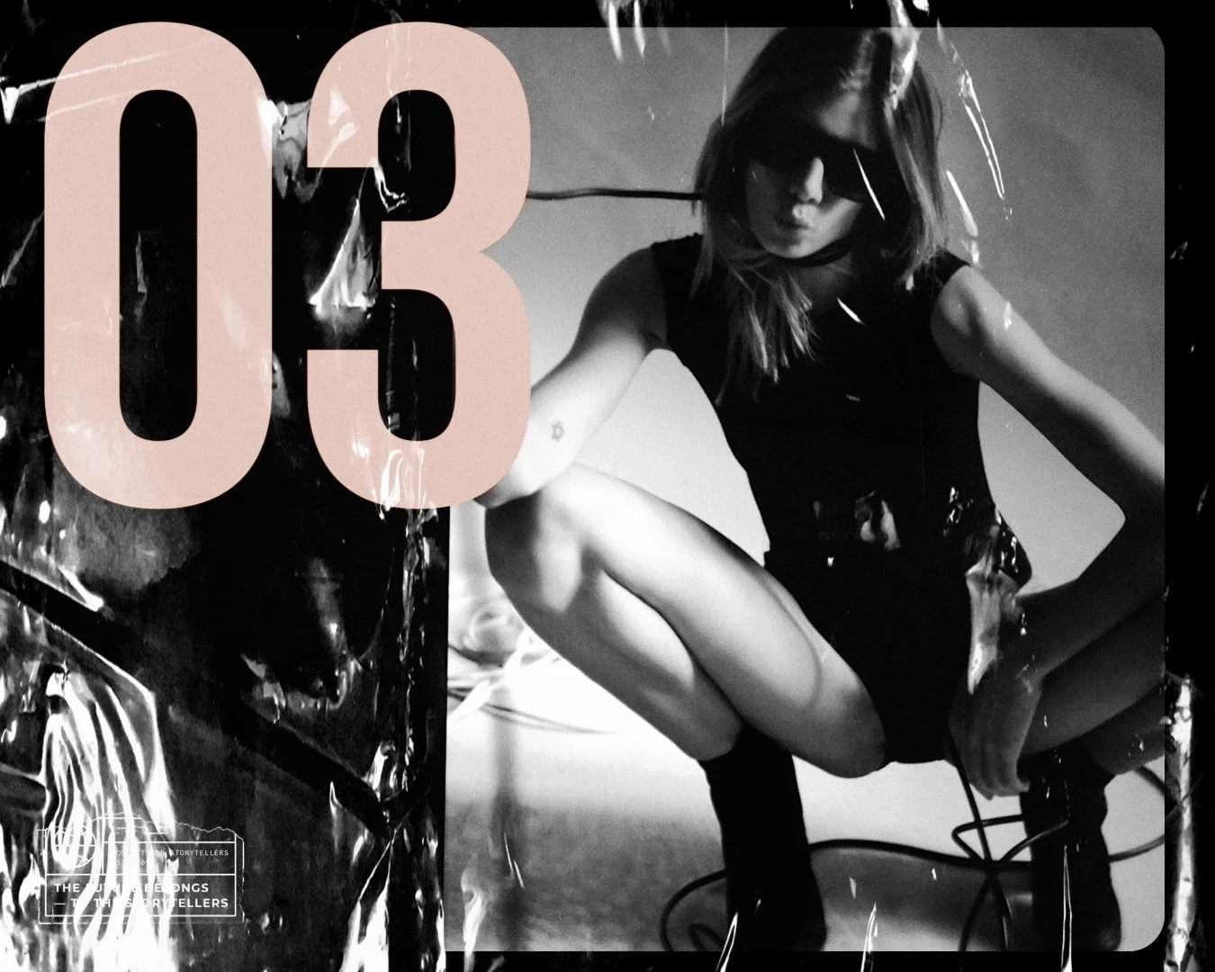A black-and-white photo of a woman squatting with her eyes behind sunglasses, wearing a sleeveless top and boots, surrounded by metallic and reflective objects, with the number '03' overlaid in pink.