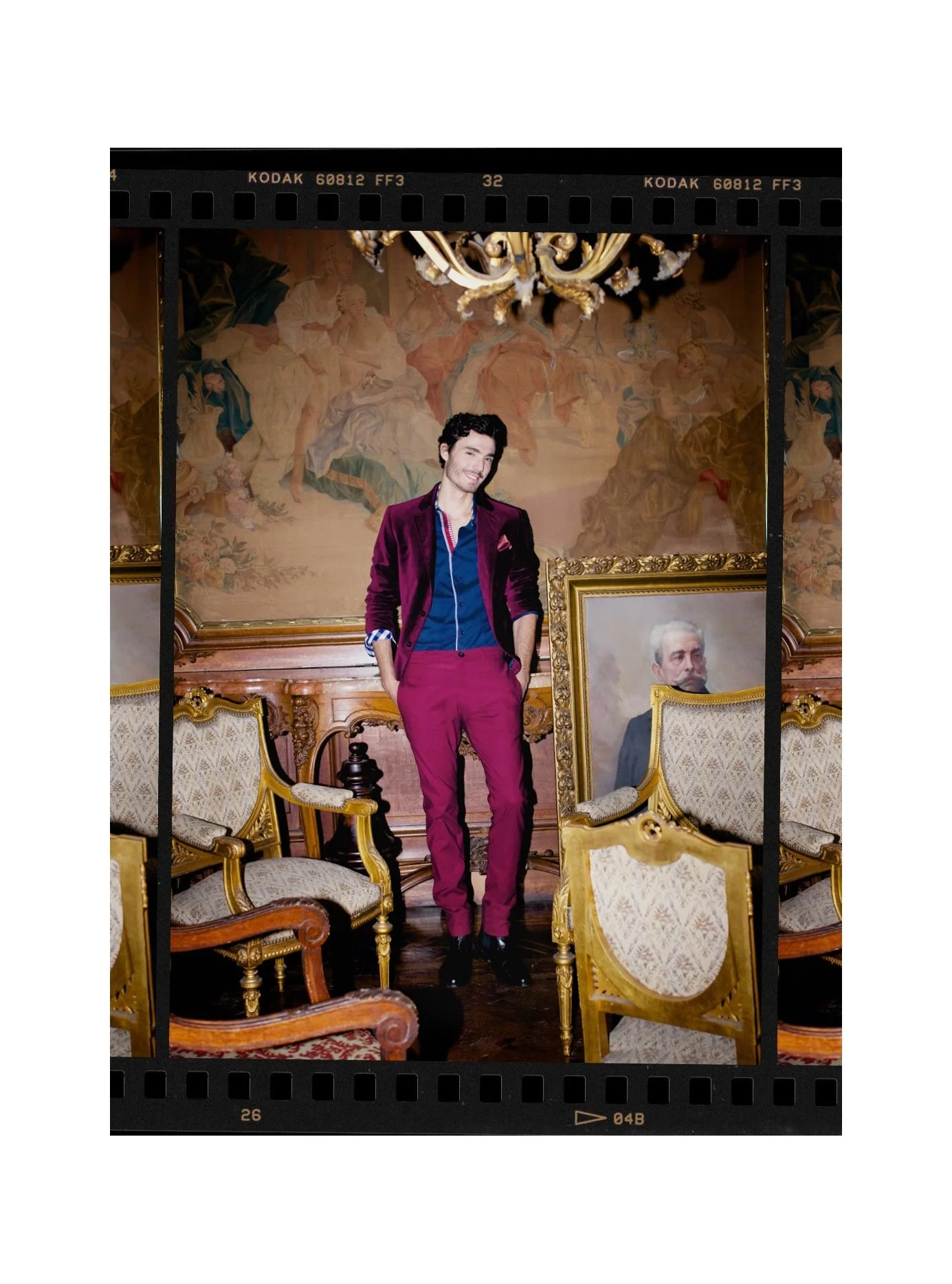 Young man with dark hair and a beard, dressed in a purple blazer, blue shirt, and pink pants, standing in an ornate room with antique chairs, a gold-framed portrait of an older man, and a large mural on the wall.