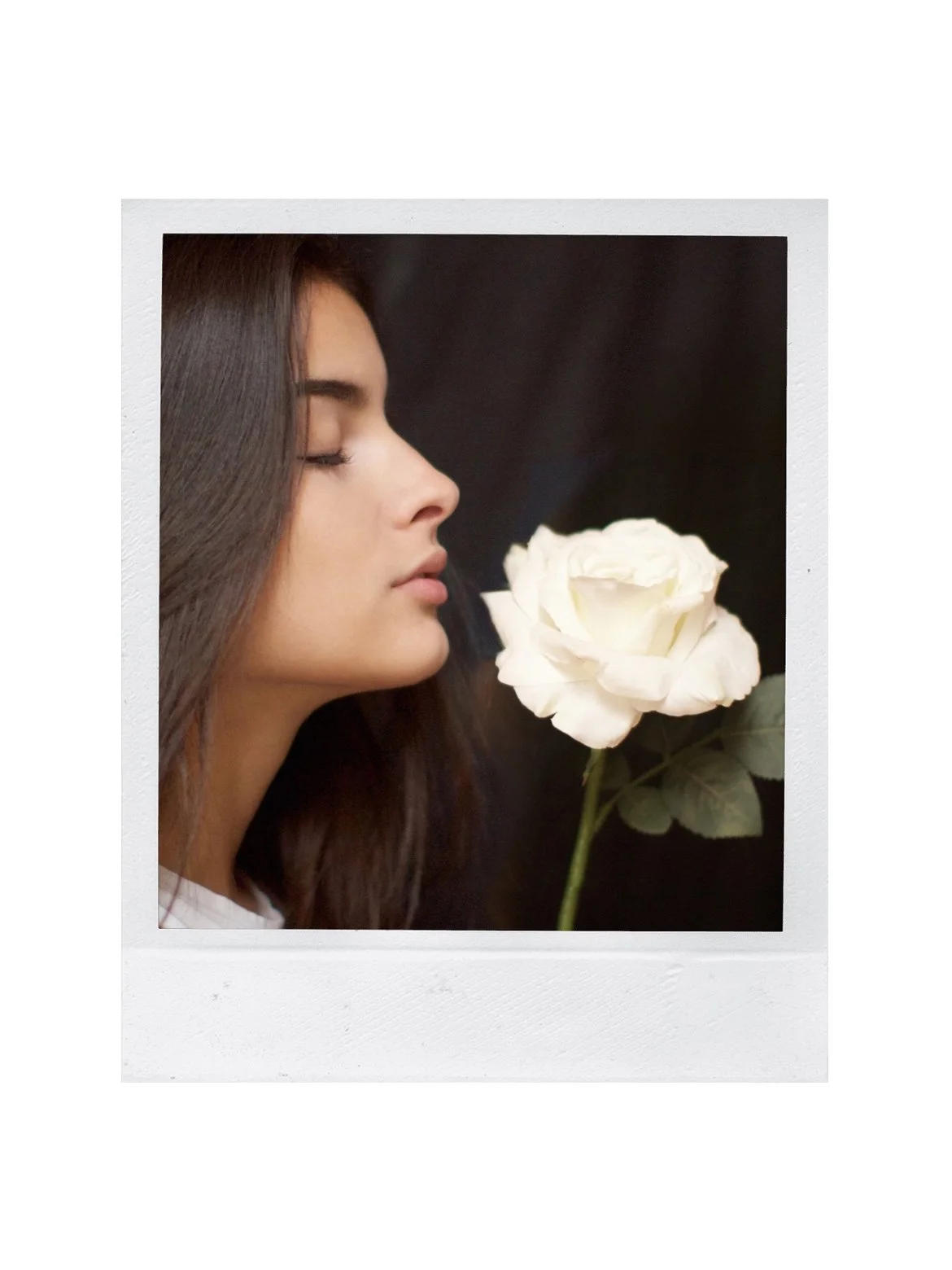 A woman with long dark hair holding a white rose close to her face with eyes closed against a dark background.