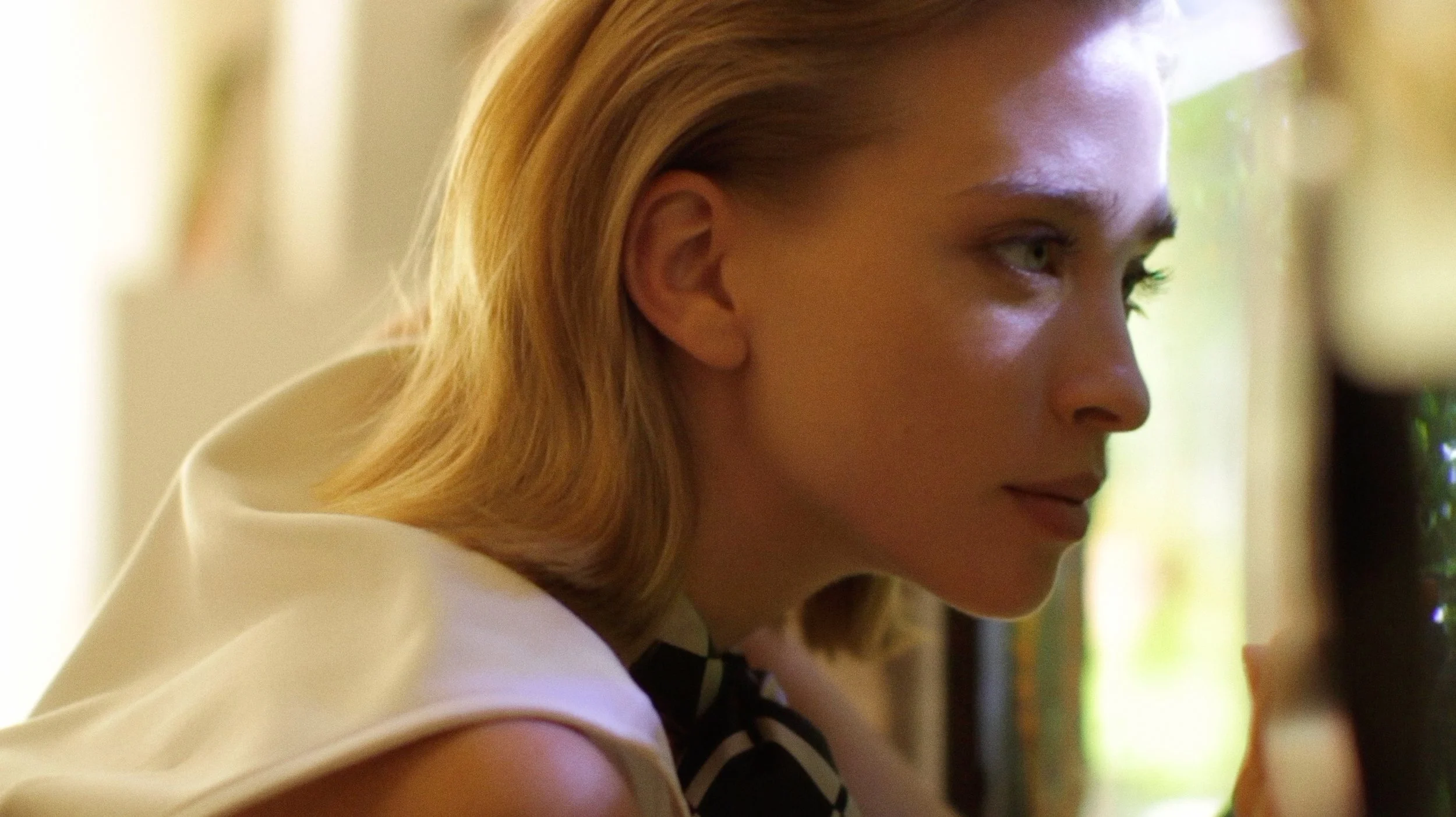 A young woman with blonde hair tied up in a bun, wearing large hoop earrings and a mesh top, stands near a chain-link fence with a blurred outdoor background.