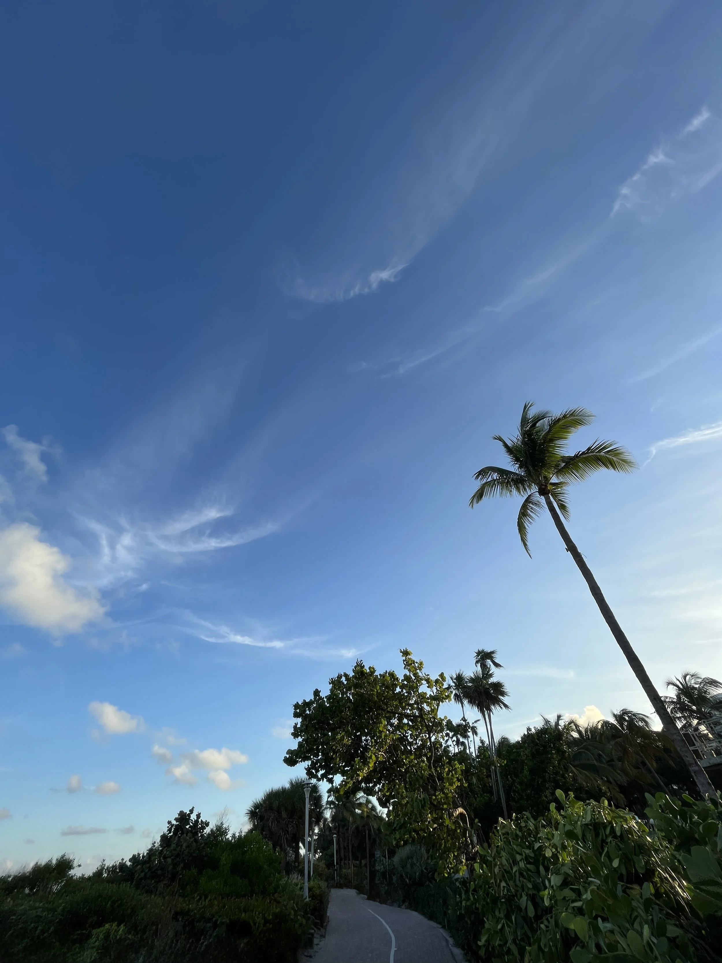 A tropical landscape in South Beach Miami with a paved walking path, tall palm trees, lush green bushes, and a bright blue sky with wispy clouds. View fullsize