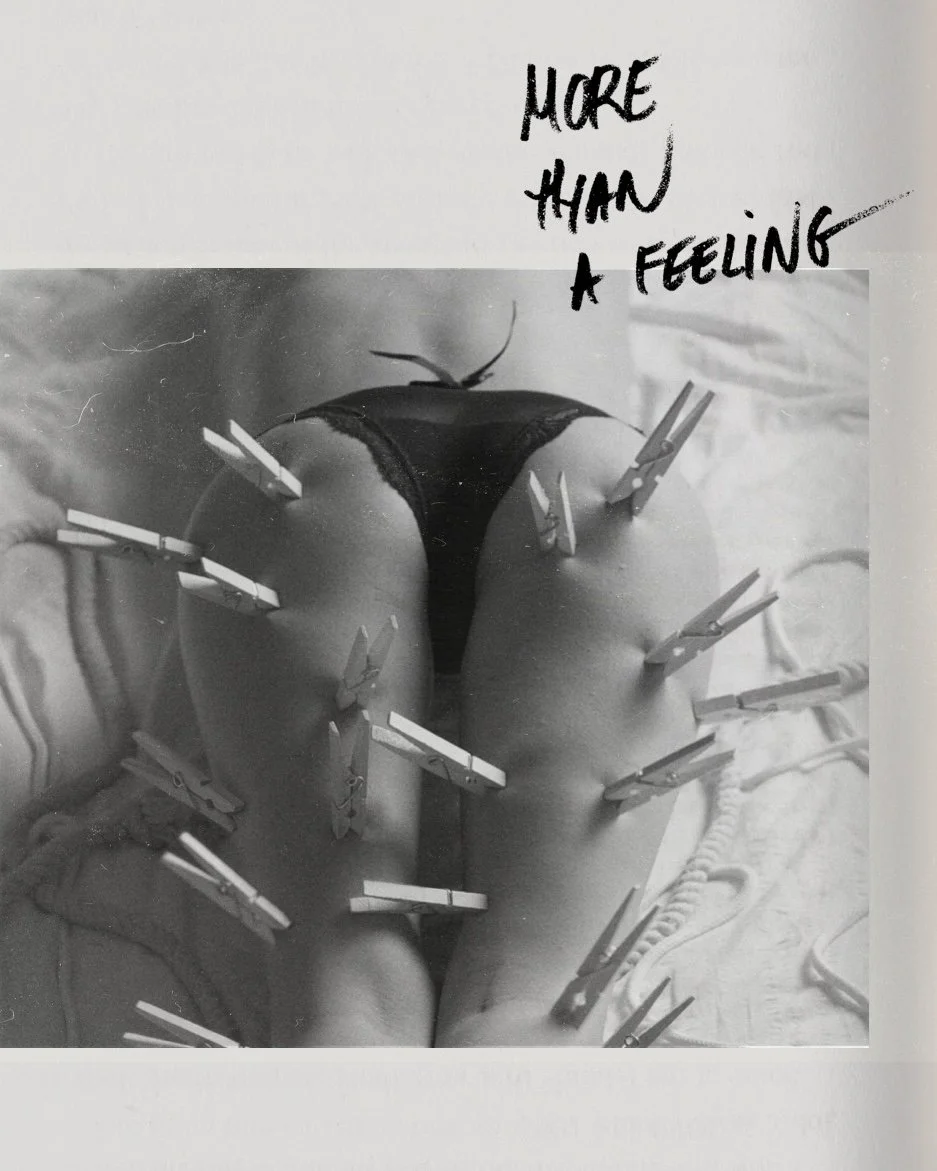 Black and white photo of a woman in underwear lying face down with clothespins attached to her buttocks and thighs, and handwritten text reading "More than a feeling".