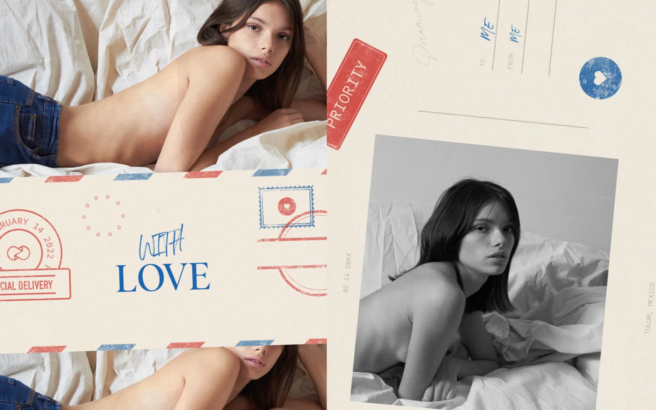 A collage of a woman lying on a bed with a mix of color and black-and-white photographs, postcards, and postage marks.