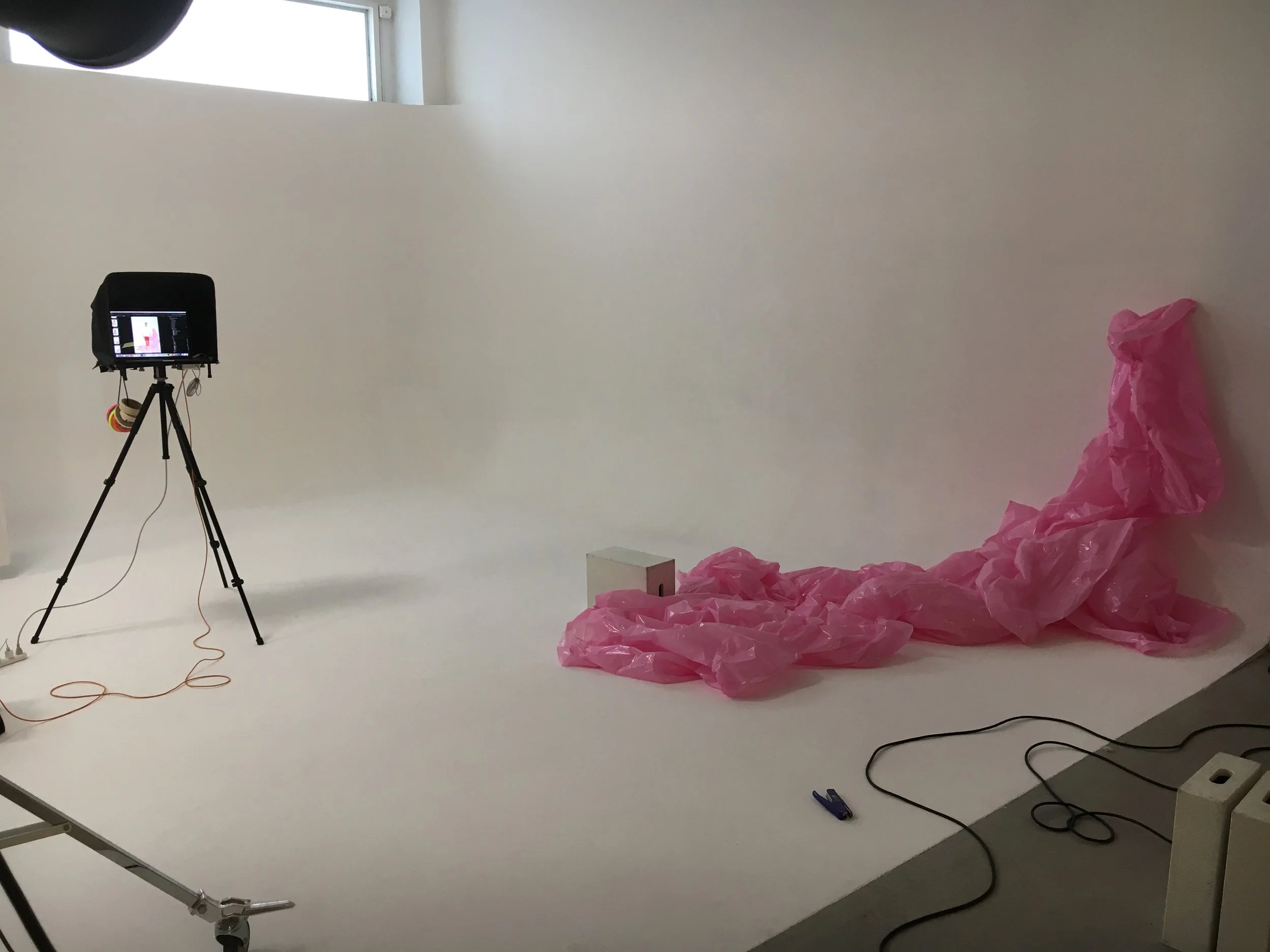 Photography studio with a white seamless backdrop, a pink plastic sheet draped on the floor, a camera on a tripod, and some electrical cords and equipment. View fullsize