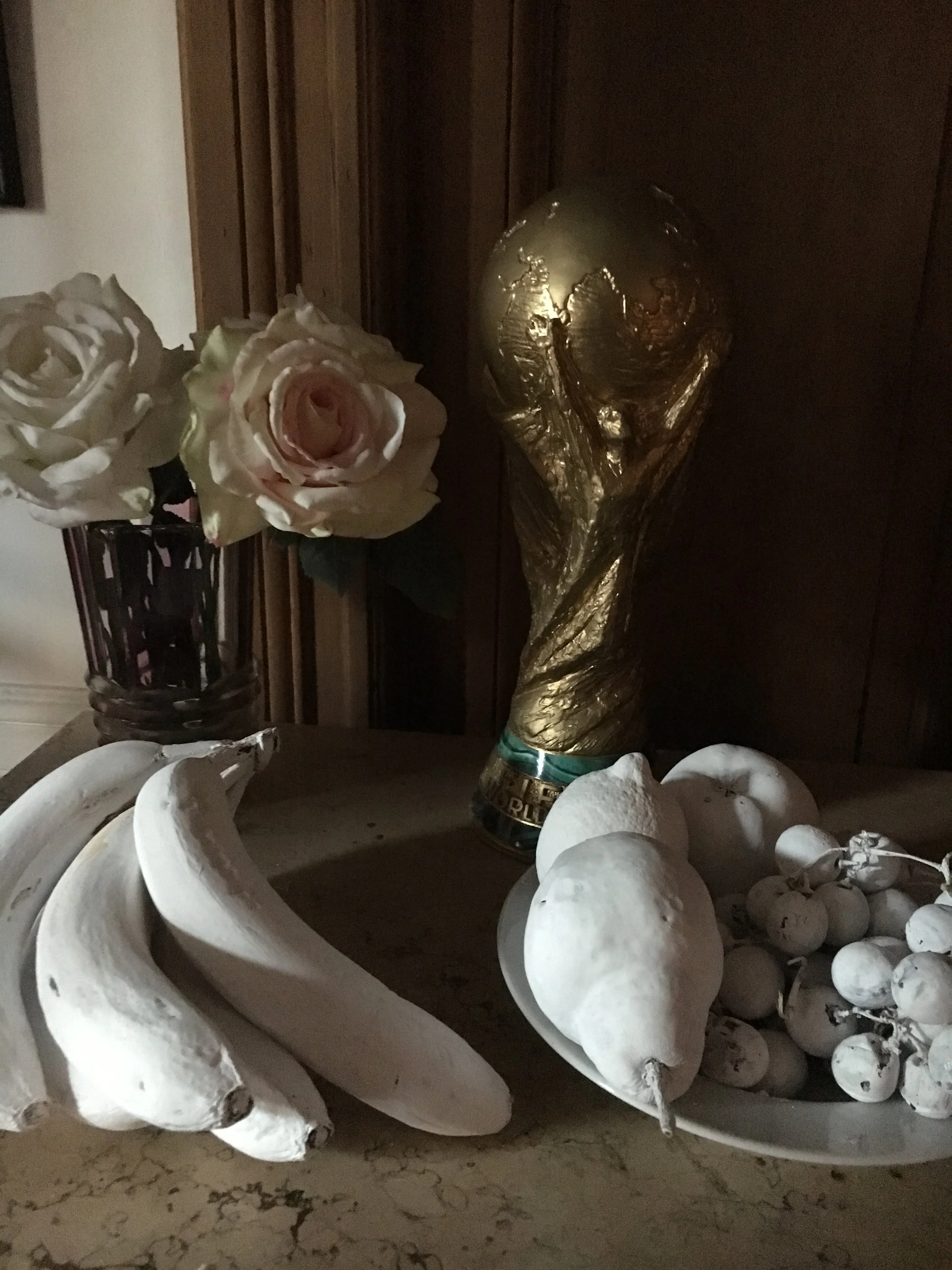 Arrangement of artificial white roses in a glass vase, a Golden World Cup trophy, and white artificial fruits including bananas, pears, and grapes on a marble surface.