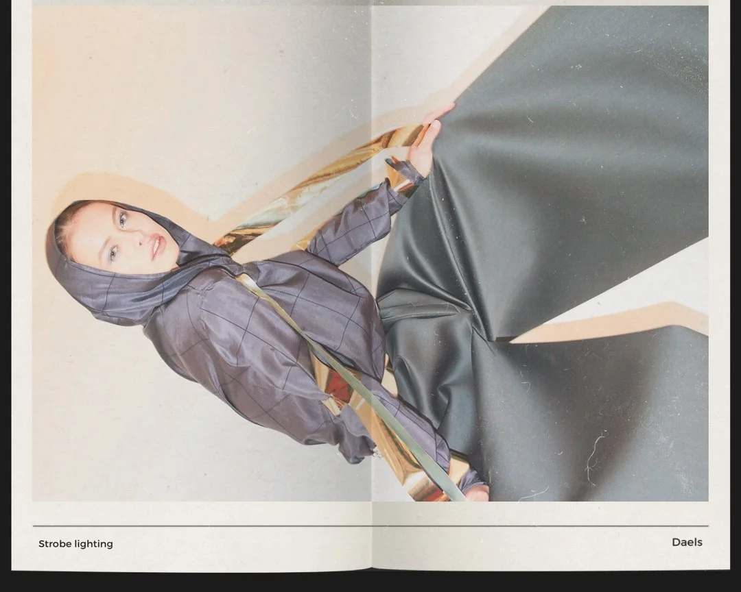 A woman dressed in dark clothing with a hood kneeling on the floor, holding back some large black fabric, with a beige and gold patterned material behind her. View fullsize