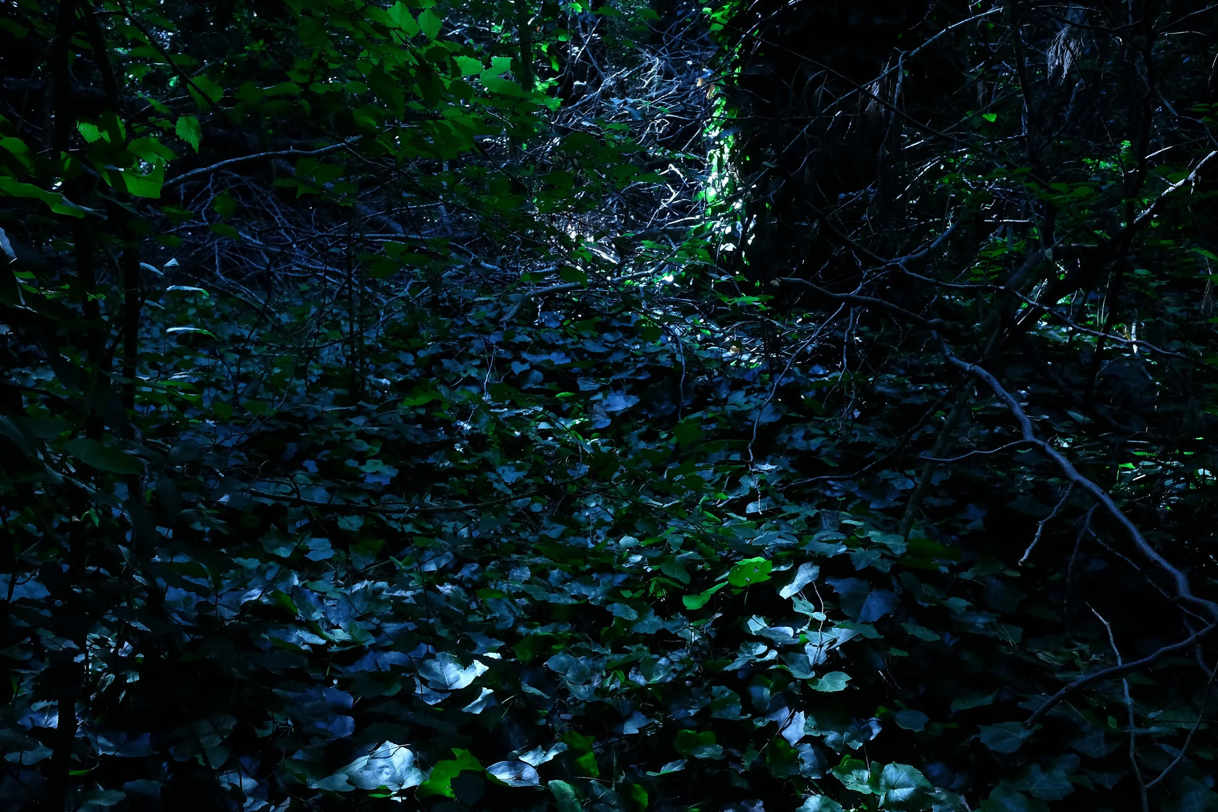 Dense forest floor covered with ivy and small plants, with sunlight filtering through the thick canopy of trees above.